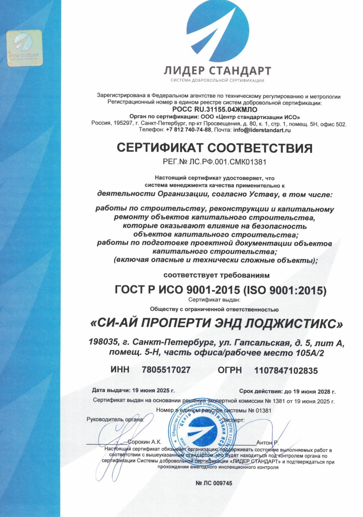 Компания CI-PROPERTY с гордостью представляет Сертификат соответствия – официальное подтверждение того, что наши объекты недвижимости, строительные технологии и управленческие процессы соответствуют самым высоким стандартам качества и безопасности.